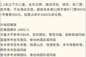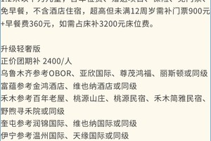 4、单房差:全程默认安排2人一间,如有单人需补单房差:优惠团期2600元,正价团期3200元。