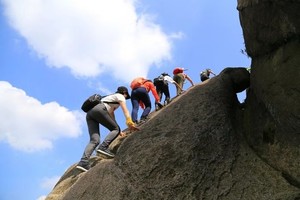 【装备】扁带、登山鞋、护膝、护腿、攀爬手套、双肩包,速干衣、遮阳帽等。两瓶水,中午带路餐。
