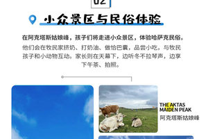 我们前往阿克塔斯姑娘峰参加亲子活动。这片草原是哈萨克族放牧人的夏季牧场,牧民们每年的夏季赶着上千头牛羊来到这里,搭起毡房过着游牧的生活。孩子们将进入牧民的家里,和牧民一起挤牛奶、打奶油、打馕、品尝待客小吃、和牧民家的小朋友孩一起跳舞做游戏,和小羊羔、小牛犊亲近拍照;此时父母们则可以放心的把孩子交给研学老师,在草原上天幕下,听着着悠扬的冬不拉乐曲,悠闲地享受草原下午茶,给自己一个放空的心境。