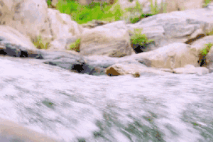 河流偶尔在陡峭的地方形成的小瀑布,透过山花看去真是别有一番风情。