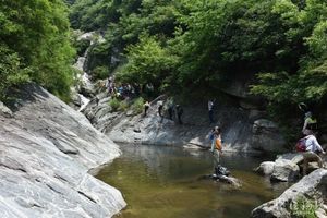 山谷中溪涧蜿蜒,奇石怪滩,流水潺潺,瀑布飞泻、响彻山谷,森林茂密、绿荫葱葱;