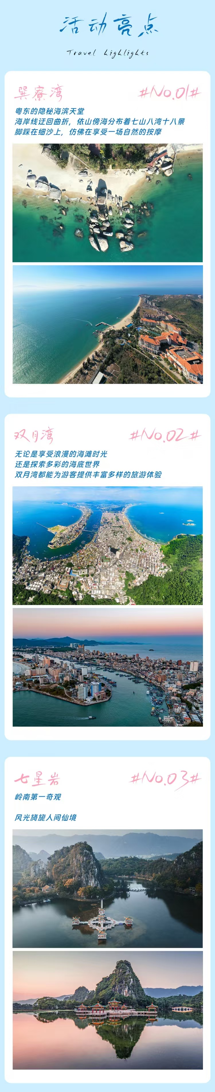 早餐后前往粤东海水最洁净的海湾之一【巽寮湾】一个被山海环绕的度假天堂,在这里感受阳光与海滩的海边之旅。这里拥有27公里的海岸线,海水清澈见底,沙滩柔软洁白,礁石形态各异,被誉为“中国的马尔代夫”,晴天下偶遇玻璃海,沙滩水质软白细,追风踏浪。晚宿巽寮湾。