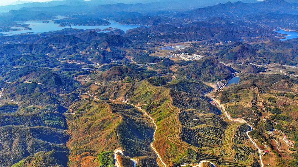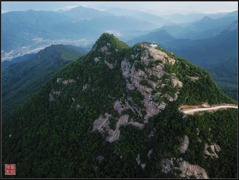 爬上山顶,辽阔壮丽的景致尽展眼前,只见那嵯峨黛绿的群山,满山蓊郁荫翳的树木与湛蓝辽阔的天空,缥缈的几缕云恰好构成了一幅雅趣盎然的淡墨山水画。