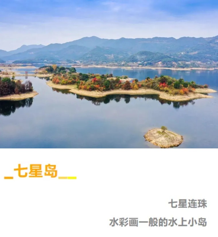 因有七个小岛形如北斗七星珠联相串,点缀于水库中心,所以称为“七星岛”。