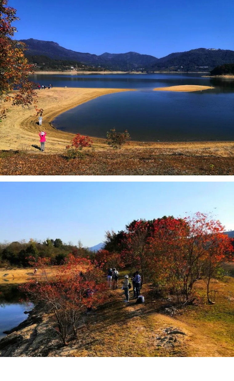 由于昼夜温差大,每年秋末冬初,当一阵阵寒潮来袭,乌桕树和枫树的树叶便留姿色在枝头,从山岭到水库岸线,红叶色彩呈梯次变化,从黄绿相间、姹紫嫣红到色彩斑驳再到七彩织锦,美得就像一幅幅水彩画,十分动人!