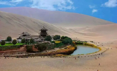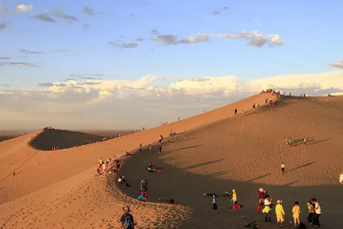 下午适时集合前往【鸣沙山·月牙泉】,这里沙滩与泉水共存,是敦煌的名片之一。月牙泉位于鸣沙山下,处 在沙丘环抱之中,因为地势的关系,刮风时沙子不往山下走,而是往山上流动,所以月牙泉永远不被沙子埋没,被誉为“沙漠之眼”。大家可以在此骑骆驼,滑沙(费用需自理),也可以去体验攀登进一步、退半步的【鸣沙山】,参观被誉为“银山四面沙环抱,一池清水绿漪涟”的天下沙漠di一泉【月牙泉】,月牙泉就像一弯新月落在黄沙之中,泉水清凉澄澈,碧波漾漾。爬上高大沙丘欣赏沙漠落日,感受“大漠孤烟直,长河落日圆”的豪情壮志,游玩尽兴后再离开。