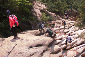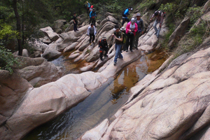 杨树堰,是一个风光旖旎的徒步线路:这里遍布奇形怪状的巨石,有的像青蛙,有的像金龟,有的像海豹,有的像雄鹰,有的像寿桃,数不胜数;这边看上像漫游的巨龟,转身后又像怒吼的老虎,真可谓步步是景点,处处是风光;满山的巨石,在大自然的造化下,仿佛是进了动物世界。我们时而在巨石之间行走,时而在峡谷之中穿越,还有潺潺小溪,风景美不胜收。