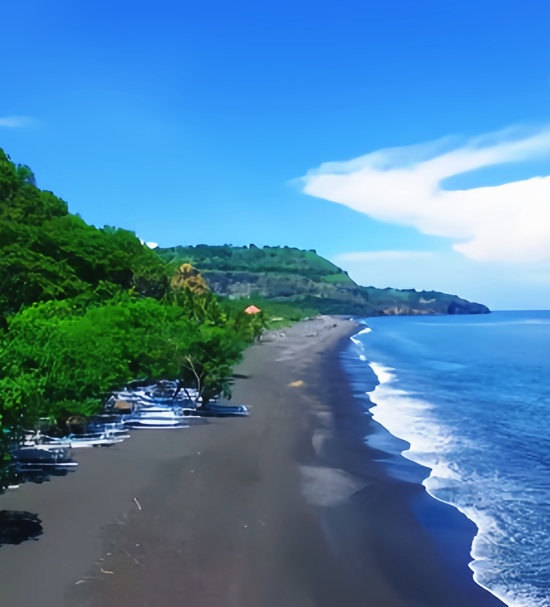 外南梦的黑沙滩,Marina Boom Beach位于外南梦市区,在这里可以远眺巴厘岛,欣赏美丽的海景。沙滩的沙子为黑色粗沙,独特的沙滩颜色能给人带来别样的视觉体验。尤其是在日落时分,嫣红的晚霞与云相互映照,天空呈现出迷人的色彩,景色十分壮观。