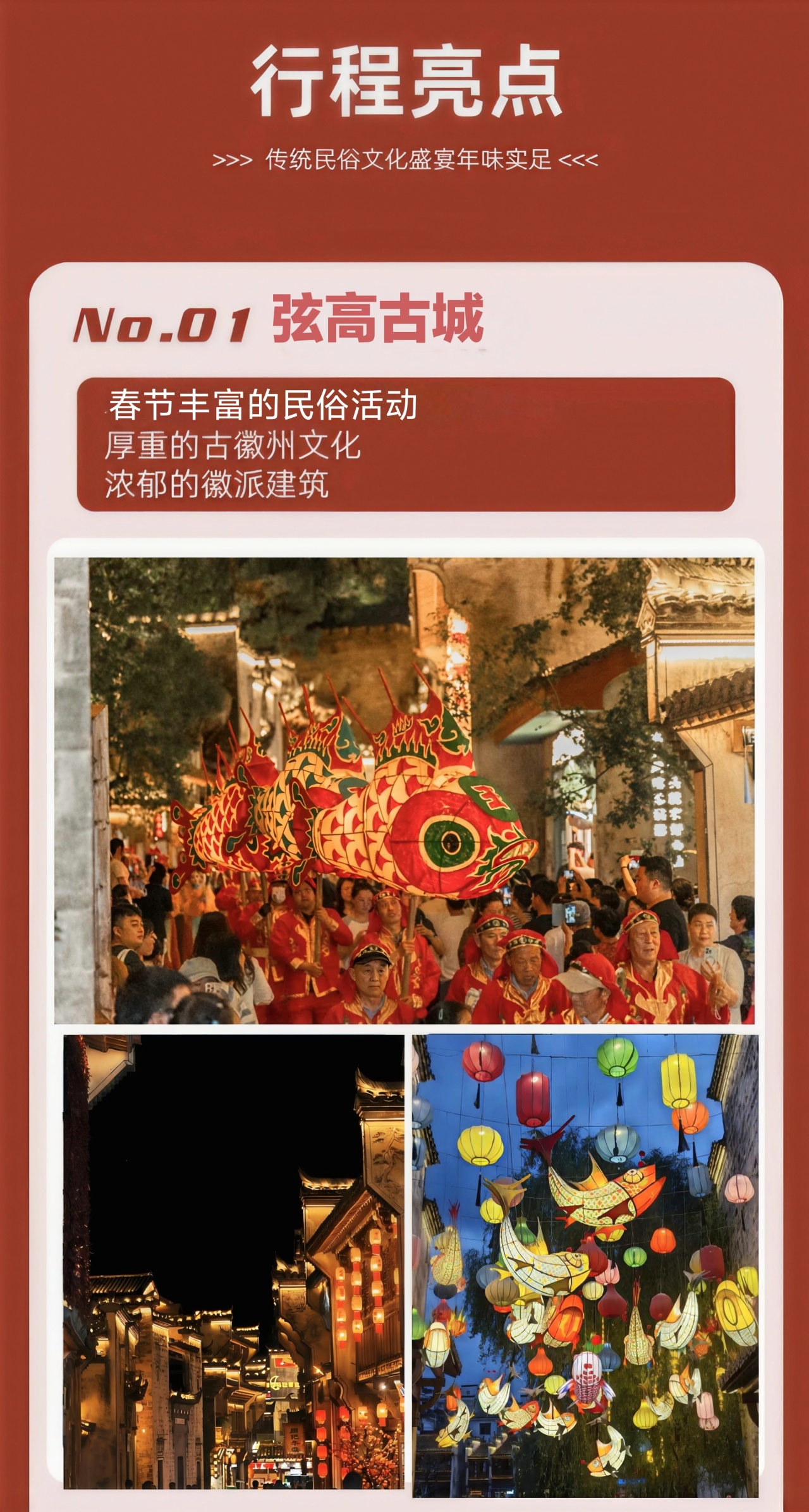 早上武汉最后一个集合点出发,约14:00到达弦高古城,办理入住后游玩。这座千年古城,正迎来春节最热闹的非遗盛宴。夜晚华灯初上,“三水、七巷、八景”的格局在灯光中渐次清晰,白墙黛瓦的马头墙下,红灯笼沿街高悬,非遗市集的烟火气扑面而来。最令人期待的鱼灯巡游于夜幕中启幕,5米巨型鱼灯领衔数十盏彩鱼灯沿街巷游弋,锣鼓喧天,烟花绽放,灯火长龙在青石板路上流动,宛如星河坠入人间。可加入巡游队伍,亲手执掌鱼灯,让光影随脚步流转,在欢声笑语中摸灯祈福,愿新岁年年有余、福气满盈。巡游过后,还能欣赏惊险的火壶表演,看匠人手持火壶凌空翻腾,火星与灯光交织照亮夜空,搭配湖畔传来的古筝雅韵,让这个新春之夜满是非遗的震撼与浪漫。夜色渐深,入住古城周边酒店民宿,在静谧中回味白日的热闹与温情,为次日旅程积蓄能量。