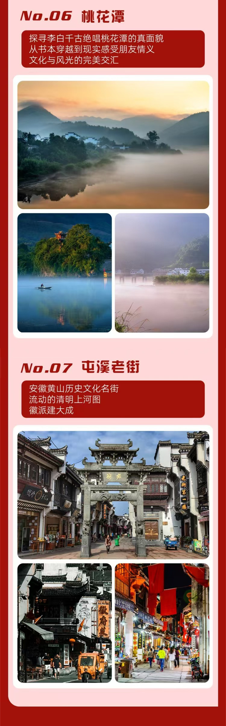 早上适时起床,前往【桃花潭】景区,早上的桃花潭是出了名的梦幻的,宛如仙境一般。晨雾为自然新景观,诗仙太白当年看到桃花仙境不过如此。