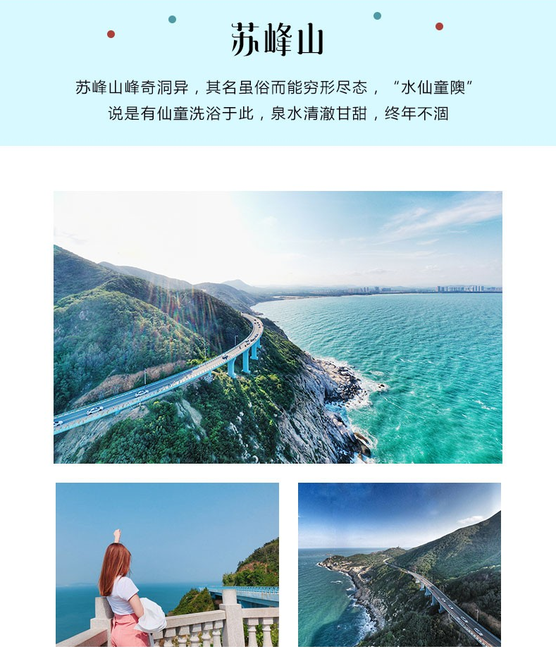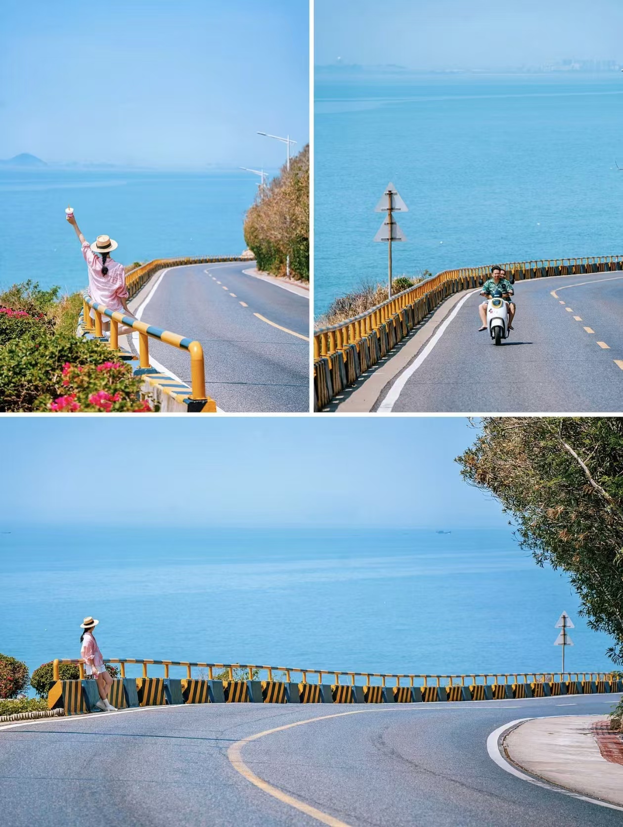 随后我们前往拥有绝美环岛路的【苏峰山】,沿着环岛公路前行,感受海风拂面,美景如画。一条天蓝色的环岛路盘桓在悬崖峭壁上,一侧是翠绿山岗,一侧是蔚蓝大海,风光旖旎,不输台湾垦丁。