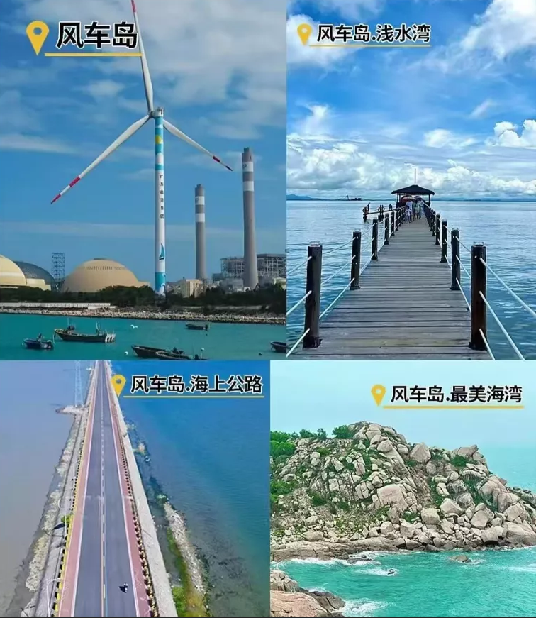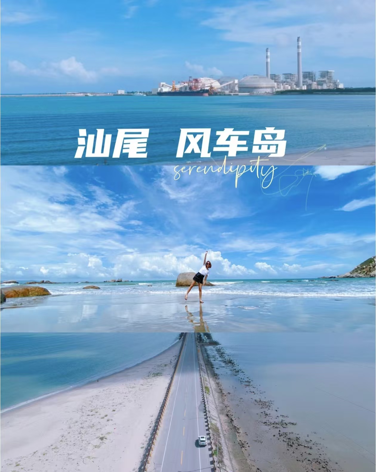 前往【汕尾风车岛】一条海上公路连接一个满是风车的岛。一架架错落有致风车和洁净沙滩、蔚蓝大海、美丽野花、翱翔飞鸟、蓝天白云,
