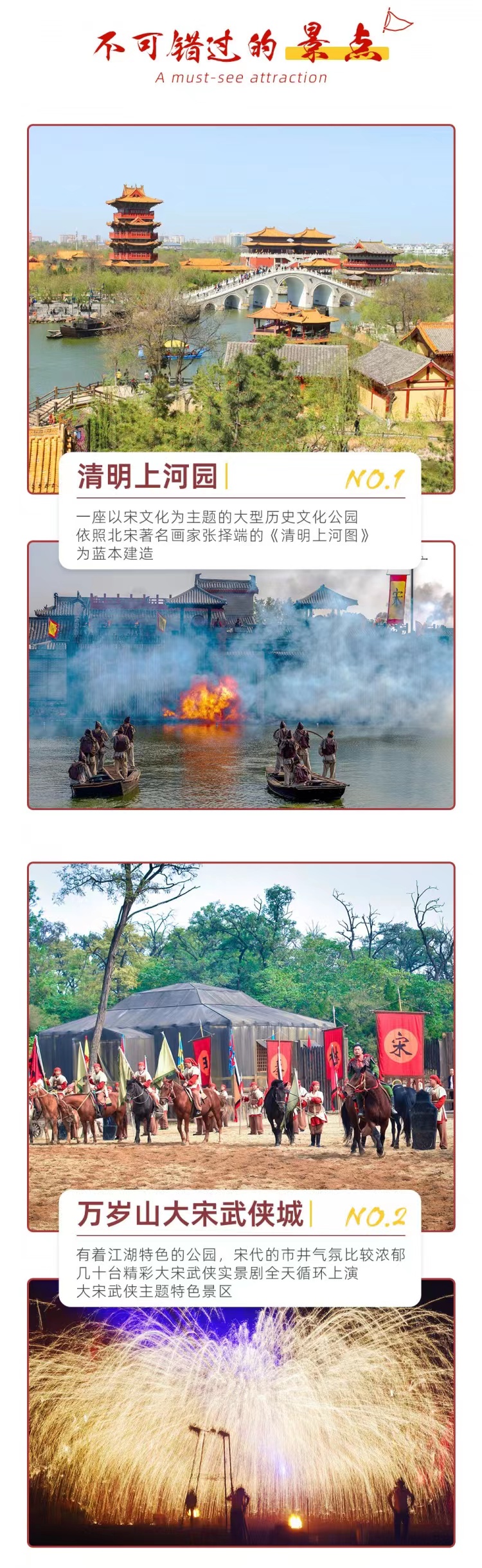 神》、《三打祝家庄》、《打铁花》等多种精彩节目,一展武侠豪情。玩一天都不重样的武侠城,可以放飞你的武侠梦轻松、好玩,让你流连忘返!晚宿开封!