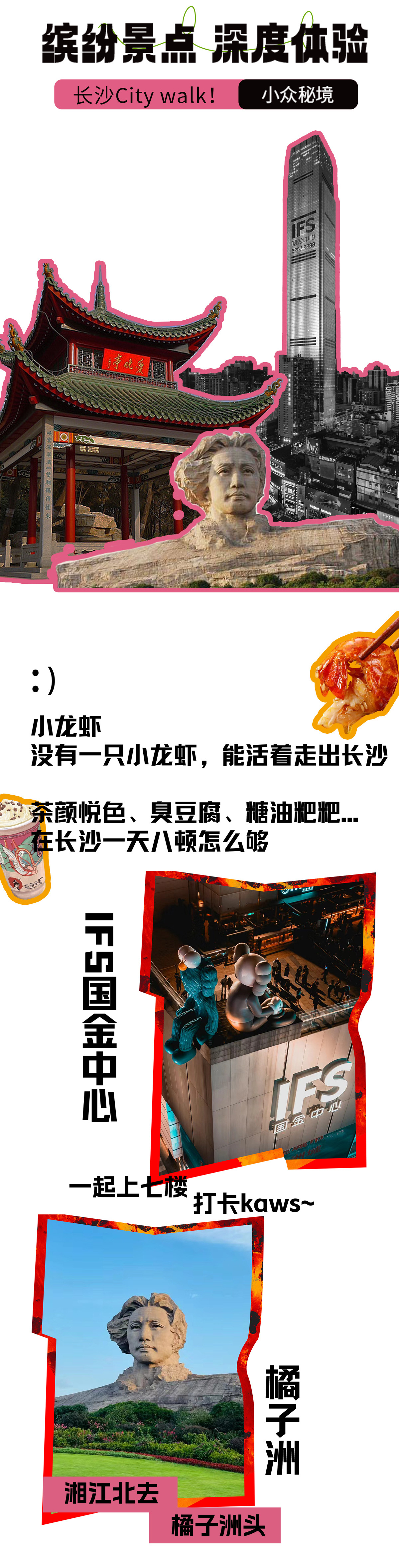 10:00 抵达长沙游玩橘子洲头景区后,自由参观游览~也可在橘子洲头景区乘地铁前往五一广场地铁站,打卡五一广场、IFS国金中心、黄兴步行街、坡子街、太平街.…从臭豆腐的“真香警告”到小龙虾的“辣到跳脚”这条gai(街)上的每一口,都是弗兰人的快乐密码!
