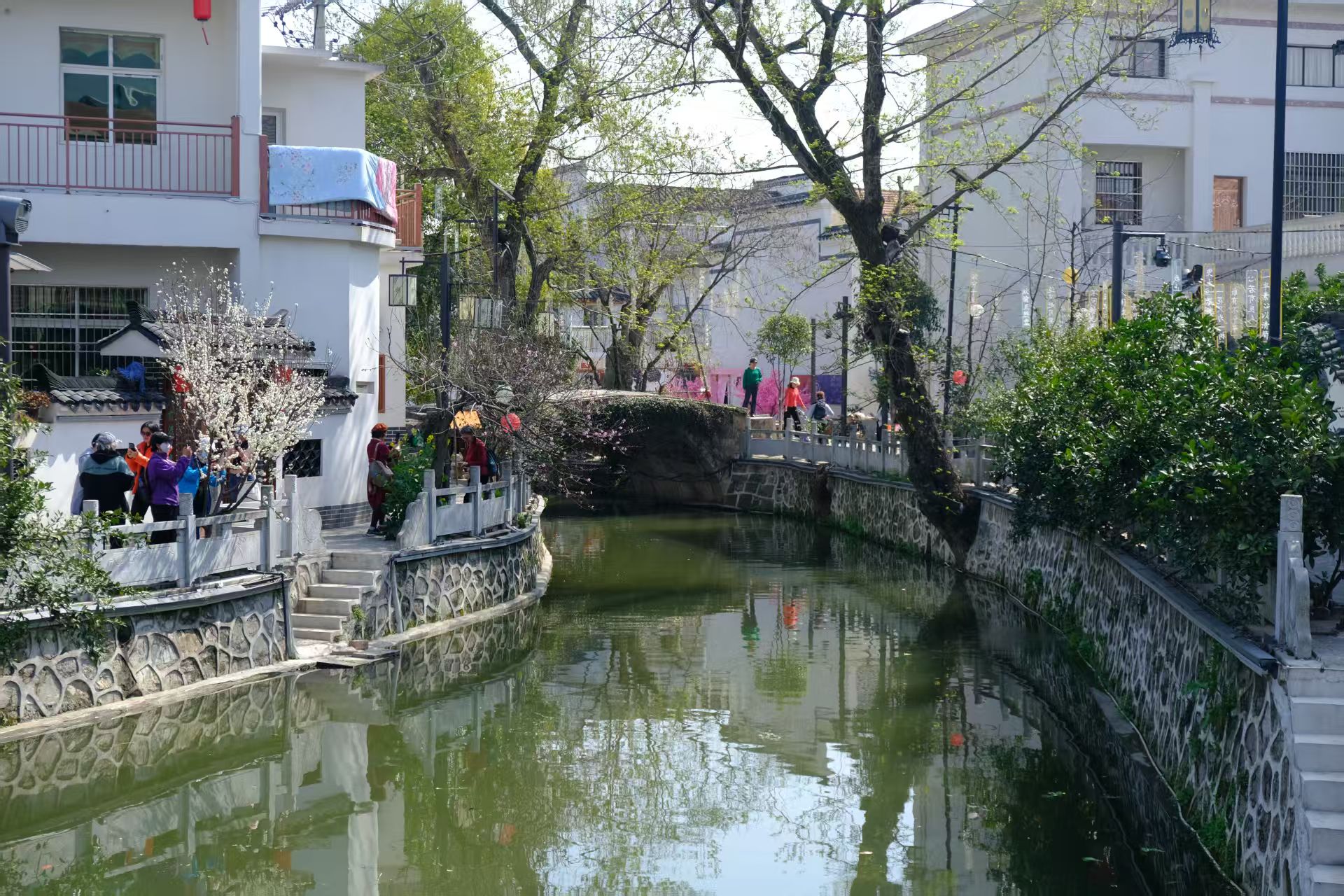 走进村庄,一条小河穿村而过,河道上架着一座石桥——白马桥,桥身被绿植覆盖。石桥边一棵粗壮的皂荚树,枝繁叶茂。据专家考证,这座桥,这棵树,都已有460多岁。